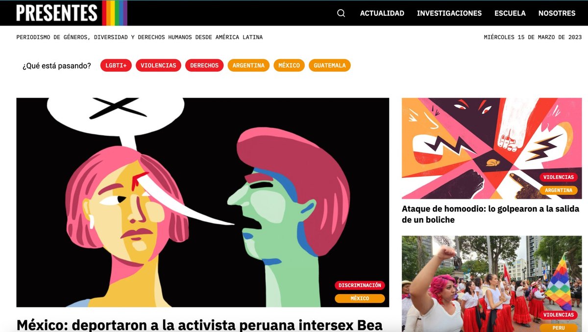 Agencia Presentes es un medio regional que cubre temáticas de diversidad sexual y cultural desde una perspectiva de géneros y derechos humanos. Nació en 2016 en Argentina como una agencia de noticias latinoamericana de temas LGBTI, siendo pionera en ese enfoque especializado y regional. Actualmente amplió sus sedes y su agenda. Desde 2020 cuenta con una sede también en México y cubre temáticas de comunidades indígenas y justicia climática, siempre desde una perspectiva de género y derechos humanos.
